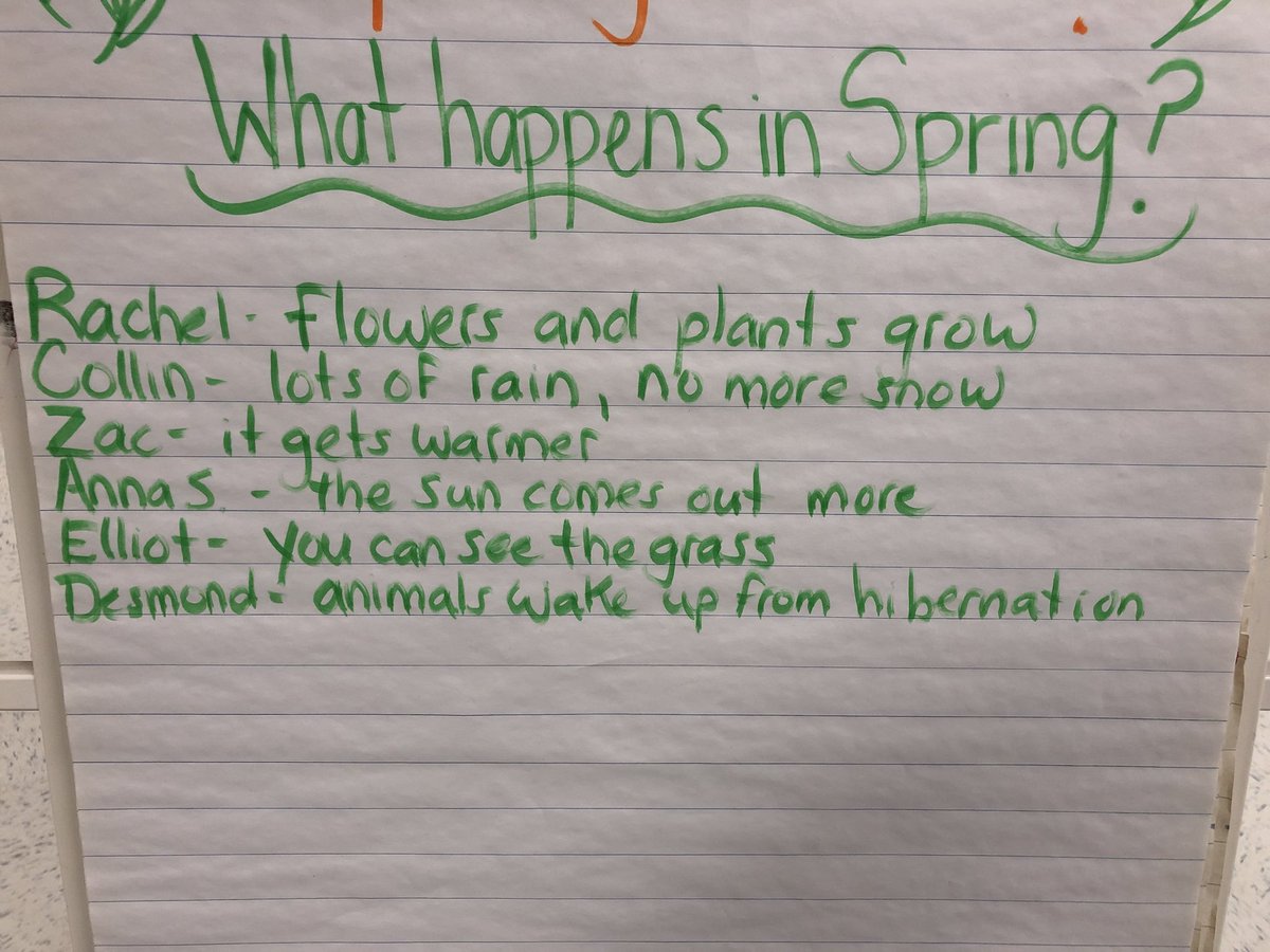 Open all the windows in your house 32. Answers may include plant- ing flowers jumping rope riding bikes watching birds and taking walks. What kinds of things did you see people doing in the spring.