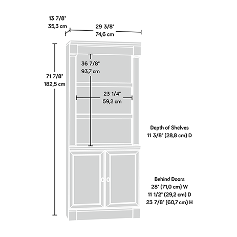 It features two spacious shelves that are ideal for storing and displaying all your miscellaneous home essentials your collectables decorative knick-knacks your most prized possessions and photos of your family. It includes three adjustable shelves hidden storage behind the elegant doors cord access on back panel and all the necessary hardware. Sauder Palladia Library wDoors.