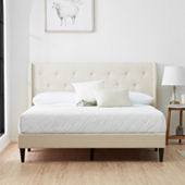 This bedroom set includes a platform bed and two 2-drawer nightstands. Install a soft and elegant design in your master suite with this linen colored upholstered bed in a box. This bed can be chosen in a king or queen.