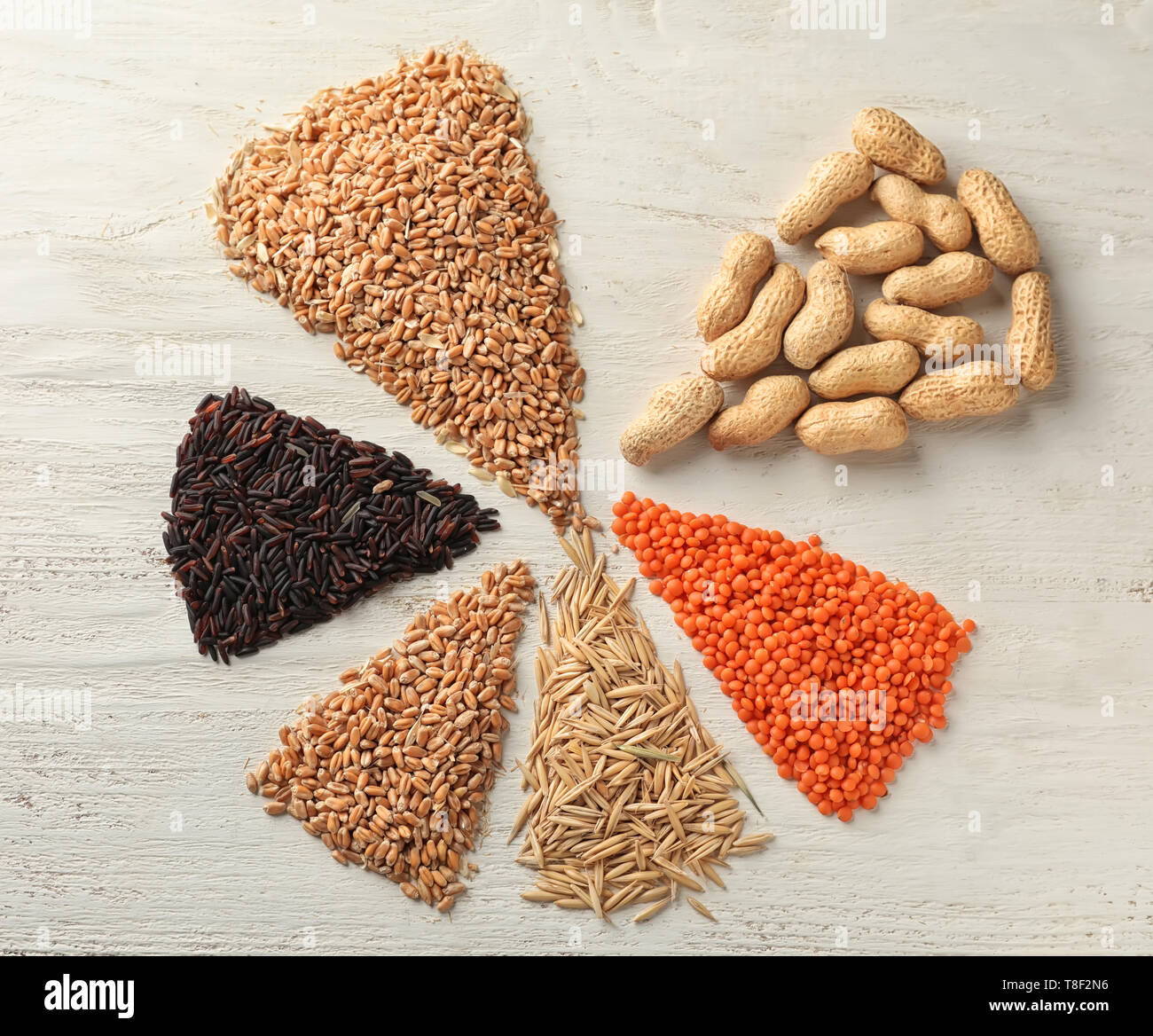 Different Types Of Grains And Cereals On White Wooden Table Stock Photo Alamy